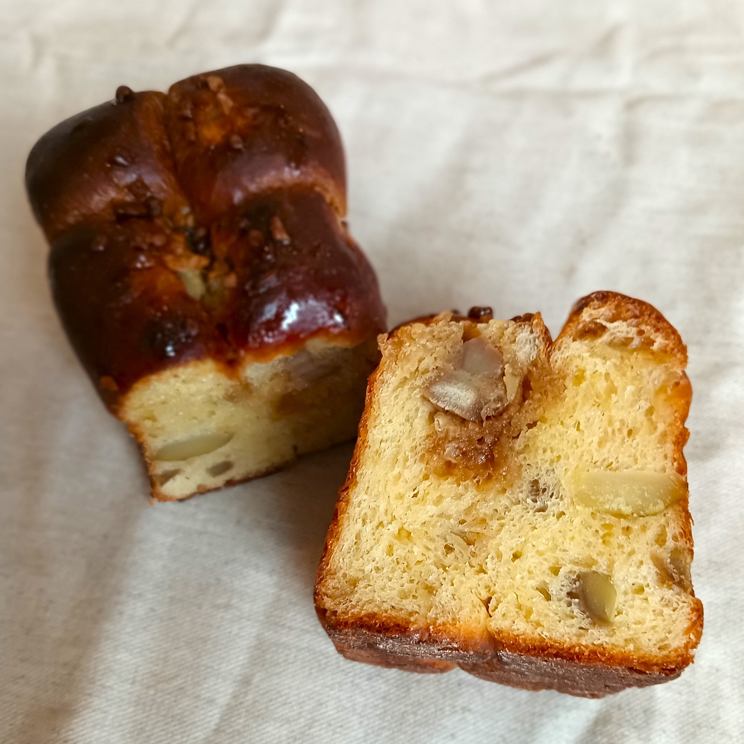 その贅沢な生地に、ラム酒で煮た有機の栗をを混ぜ込み、上にはたっぷりのメープルシュガーと焼き上がりのメープルシロップでおめかし。